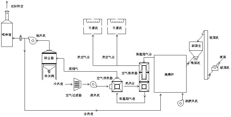經(jīng)過項(xiàng)目小組的討論與研究,本系統(tǒng)采用了沸騰爐、列管式換熱器、多管+水膜除塵等工藝組成,沸騰爐采用流化床燃燒技術(shù),燃料適應(yīng)性廣,能燃用熱值低于3000kcal/kg的各種煤,且供熱溫度溫度可調(diào),調(diào)溫迅速,燃燼率高達(dá)99%;列管式換熱器高溫段采用耐熱不銹鋼材質(zhì),并設(shè)計(jì)獨(dú)特的梅花狀噴流管結(jié)構(gòu),能有效提升換熱效率,合理的管束排列,能控制煙氣流速穩(wěn)定在10m/s,可避免管子積灰;除塵系統(tǒng)為干法+濕法方案,即廢煙氣先經(jīng)過多管多除塵器,該除塵器由多個(gè)陶瓷旋風(fēng)子組成,除塵效率可達(dá)95%以上,風(fēng)阻小于900Pa,運(yùn)行成本低;再進(jìn)入水膜除塵塔,可對(duì)廢氣進(jìn)一步凈化,加入脫硫劑,可對(duì)煙氣進(jìn)行脫硫。